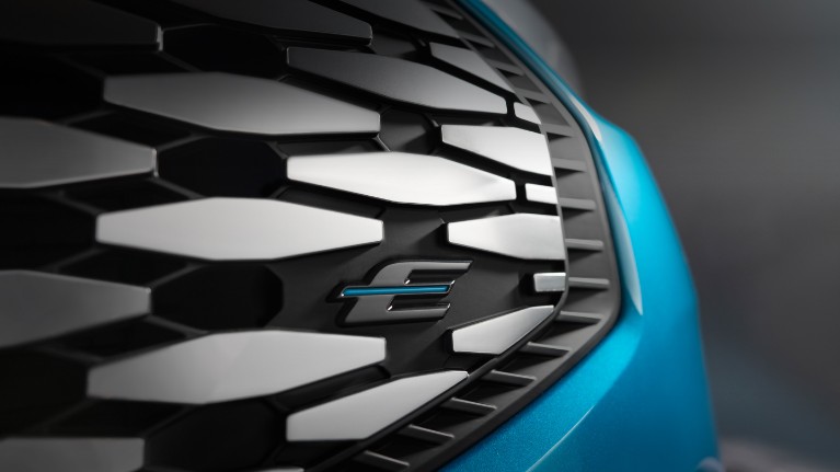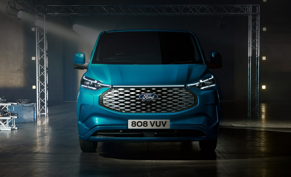Nový exteriér E-Transit Custom zahŕňa nezameniteľné svetlomety spojené LED pásom osvetľujúcim šírku kapoty a lichobežníkovú prednú masku s polygonálnym dizajnom.